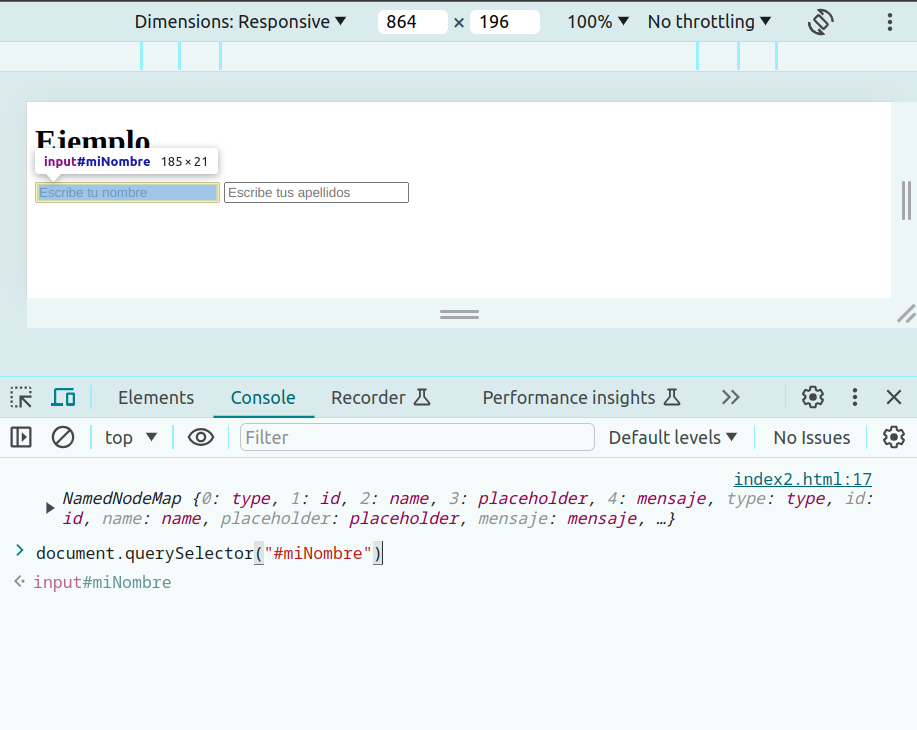 En la imagen se puede apreciar que además de mostrar los resultados de la instrucción console.log() se puede interactuar con la consola y ejecutar código como el mostrado: document.querySelector("#miNombre")