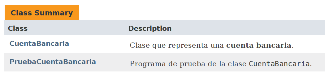 3. (en la solución) el código apropiadamente comentado con comentarios javadoc para conseguir obtener la documentación deseada en el formato que aparece en la captura de pantalla.