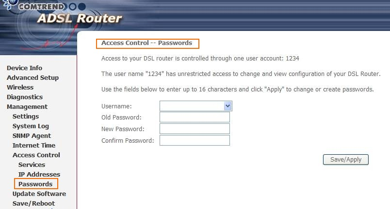 Los routers suelen tener una interfaz de administración vía web a través de la cual podremos cambiar su configuración y contraseña de acceso. La opción del menú donde cambiaremos la clave de acceso variará según el fabricante y modelo del router. Por ejemplo, en la siguiente imagen, para un router Comtrend modelo CT-5361, la opción está en Management – Access Control – Passwords. Tomaremos este modelo de enrutador inalámbrico como referencia en los siguientes apartados.