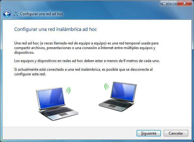 El modo Ad Hoc por el contrario, permite conectar dos equipos de manera directa, sin necesidad de punto de acceso intermedio o router WiFi. Estas redes se conocen como Ad hoc y, aún no siendo tan utilizadas como las anteriores, nos permiten enlazar nuestros equipos portátiles entre sí. Por ejemplo, conectar dos portátiles entre sí para intercambiar datos sin necesidad de punto de acceso, también podemos conectarnos directamente a una impresora con interfaz WiFi, o enlazar nuestro portátil a la TabletTablet(En español tableta), es un tipo de ordenador portátil de dimensiones reducidas con el que se puede interactuar a través de una pantalla táctil. o PDA para navegar por Internet sin cables, etc. El modo Ad hoc no es muy utilizado pero Windows nos permite configurar este tipo de redes desde su Centro de redes y recursos compartidos.