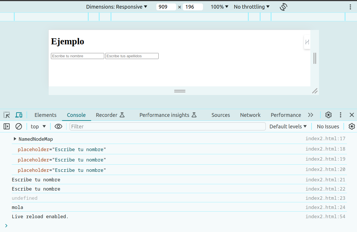 En la imagen se puede apreciar que además de mostrar los resultados de la instrucción console.log() se puede interactuar con la consola y ejecutar código como el mostrado: document.querySelector("#miNombre")